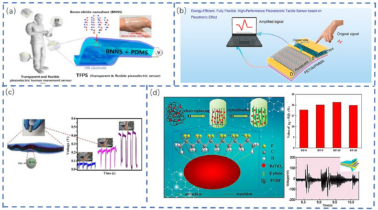 Ultrathin sensing devices utilizing piezoelectric materials have become an important part of developing piezoelectric sensors for continuous bio-signal monitoring systems that can conform to the contours of the skin. Kim et al. [51] developed a transparent and biocompatible BNNS piezoelectric sensor using BNNS and PDMS as a piezoelectric active and flexible element, respectively (Figure 6a). These sensors can generate electrical energy with various signal forms for monitoring body movement. Moreover, Wang et al. [52] proposed an energy-saving and fully flexible piezoelectric sensor (Figure 6b), which was possible through the integration of PVDF nanorod arrays with excellent mechanical force–electrical pulse conversion. These are based on piezoelectric effect-polarized PVDF arrays, which generate sufficient charge to drive the device and realize self-signal amplification, meaning the fabricated sensor has a good pressure sensitivity, detection limit, and response time. Yang et al. [53] introduced PDA as a surface modifier to BTO and blended it with a PVDF matrix in different proportions to form homogeneous PDA/BTO/PVDF composites. From this, a flexible piezoelectric pressure sensor was fabricated using the surface solution casting technique (Figure 6c). The sensor was shown to detect joint bending and human motion exhibited by different movement styles in different signal curves. Additionally, Jiang et al. [54] produced PVDF nanocomposites containing BaTiO3 nanoparticles and incorporated them, via electrospinning, into flexible piezoelectric pressure tactile sensors (Figure 6d). These sensors demonstrated a good flexibility and linear response to external mechanical force, and were able to detect different musical sounds.