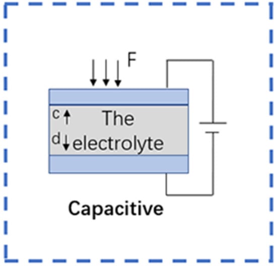 When a flexible capacitive sensor is subjected to external pressure (the magnitude of which can be calculated by measuring the changes in the electrical signals), the capacitance value between the electrode plates also changes [55], causing changes in other electrical signals. Generally, flexible capacitive sensors are dielectric materials with a microstructure added to the middle of the flexible electrode. This microstructure changes significantly under the action of external pressure, which results in changes in the dielectric properties of the dielectric material and thus the capacitance value as well [56]. The sensitivity of flexible capacitive sensors can generally be improved by substituting the material of the dielectric layer, performing related structural modifications, or by compounding the substrate with a substance with a high dielectric constant [57]. Figure 7 shows the signal conversion mechanism of the capacitive flexible sensor.