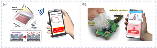 Application of a flexible sensor based on a chemical formula: (a) schematic diagram of a self-powered H2 gas sensor [103]; (b) surface-active tuned metal oxide chemical resistor for direct analysis of human mouth odor [104].