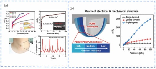 Application of flexible sensors on e-skin: (a) a schematic diagram of a flexible pressure sensor based on a wrinkled microstructure with relative capacitance change as a function of the pressure, mounted on a human throat for vocal recognition tests [171]; (b) a multilayer PEDOT:PSS/PUD located on the top of a micro-dome pattern PDMS layer with different layers of pressure-related relative current changes in a multilayered electronic skin [172].