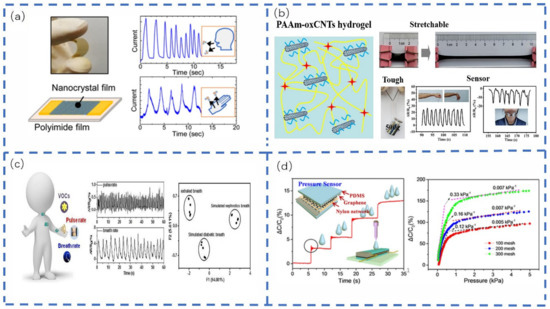 Kano et al. [173] developed a fast-responding nanocrystal-based humidity sensor, which varied the current reading by 5 orders of magnitude over an 8–83% relative humidity range (Figure 11a). The sensor exhibited a fast response to humidity changes with a response/recovery time of 40 ms at 3 Hz. The research team demonstrated its use in monitoring human breathing and moisture evaporation from the skin in real-time. Furthermore, Shi et al. [69] proposed a simple and low-cost method for fabricating flexible piezoresistive pressure sensors with a large area layered structure. Sun et al. [174] assembled a conductive nanocomposite hydrogel composed of oxidized MWCNTs and PAM (Figure 11b). Xu et al. [175] studied and produced a multifunctional flexible sensor based on two different graphene films, which can detect physiological signals and biomarkers simultaneously without mutual interference. The sensor detects different human physiological signals, such as the pulse and respiratory rate. It has an excellent detection ability by directly attaching to different human body parts (Figure 11c). He et al. [73] developed a cost-effective nylon mesh for a simple capacitive sensor (Figure 11d), which incorporated a nylon mesh with regularly distributed microscale square holes. This sensor exhibited high sensitivity up to 0.33 KPa−1 in the low-pressure range and continued to do so after more than 1050 repetitive cycles at 400 and 1000 Pa. This confirmed its long operational durability and an ultra-low detection limit below 3.3 Pa, which can be applied to real-time monitoring of the human pulse.