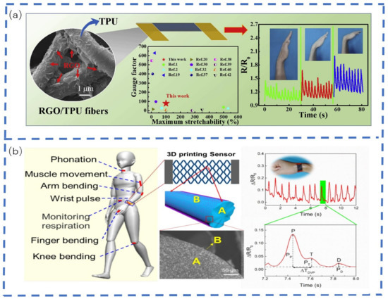 Wang et al. [176] devised a flexible resistive strain sensor with a special three-dimensional conductive network using a flexible TPU fiber mat decorated with reduced GO (Figure 12a). This strain sensor demonstrated excellent electrical properties, hyper-elasticity, high sensitivity, good durability, and fast responsiveness. The full range of human motion detection (including large and fine human motions such as walking, jumping, finger bending, coughing, vocalization, and fine muscle movements of the cheeks) indicated this sensor had a wide range of applications. Using the solution method and ultrasonic dispersion technology, Yang et al. [177] prepared a room-temperature RTV silicone rubber based on CF and CB with excellent elasticity and high electrical conductivity of rubber composites. The sensitivity properties and strain sensing mechanism of CF/CB-RTV silicone rubber sensors were investigated, and it was concluded that the prepared composites have great potential as smart monitoring strain sensors and flexible electrodes. This study thus provided an important alternative solution for the fabrication of low-cost and high-performance strain sensors and electrodes based on conductive elastomer composites. Ergen et al. [178] developed an aerogel-based strain and sweat sensor able to efficiently extract real-time information by combining involuntary human motion and chemical signals. These sensors possessed good mechanical integrity, allowed high-density electrical energy generation during fine body movements, and could be applied to continuous human motion monitoring by measuring the pH, ion concentration, and volume of secreted sweat. Pu et al. [179] fabricated sensors for targeted detection by oxidation of a Ti3C2Tx MXene surface to form nanocrystalline TiO2, which were surmised to function by forming a sensor with strongly interacting sensing layers. The strain off-domain was efficiently converted into strain localization by introducing a loose isolated network structure in the sensing layer and two distinct sensing layers with microcrack and through-crack patterns were easily fabricated. The sensors exhibited an excellent performance, including flexibility, fuzzy drift, frequency stability, fast response and relaxation time, and long-term durability. It was concluded that it is highly feasible to achieve a full range of human motion monitoring demonstrations by selectively using sensors for targeted deformation detection. Ma et al. [180] manufactured a strain sensor with high sensitivity and an extensive working strain range based on 3D printing technology and plasma processing (Figure 12b). The concept of a self-compensating second-order structure is proposed for the first time to balance the sensitivity within the strain range (0–350%). At strains below 20%, the sliding and breaking of the graphene sheet coated on the grid surface dramatically improved the sensor’s sensitivity, up to 20 times as much as that of the non-second-order structure sensor. This unique structural design enables sensors to detect the full range of human motion, from pulse and acoustic vibration to breathing and arm bending, providing a new approach for the development of a new generation of full-range strain.