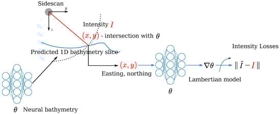 Overview pipeline of the proposed method. The bathymetry is represented by a neural network which takes the easting and northing as the input and output the corresponding height of the seafloor. Given and the sonar’s current attitude we can find the positions of the sonar echoes and the gradients of the bathymetry are computed ( is differentiable) so that we can use a Lambertian model to estimate the corresponding intensities . The measured SSS intensities I are used as a reference to compute the loss and we use a gradient-based optimizer to optimize the bathymetry so that the simulated intensities match the measured ones.