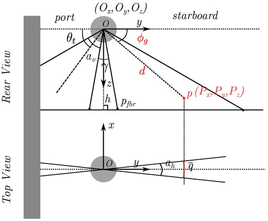 Sidescan sonar illustration in Forward Lateral Down (FLD) frame (modified from [17]). The sidescan sonar usually has two heads symmetrically mounted on the port and starboard side of the AUV with a fixed angle , often referred as to tilt angle, which is the angle between the horizontal axis and the center of the vertical beam . There is usually a gap between the two heads leaving a nadir gap where sidescan does not have coverage. Sidescan usually has a wide vertical beam (often referred as to the sensor opening in the -plane) and very narrow horizontal beam (often referred as to the sensor opening in the -plane).