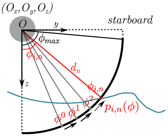 Similar to our previous work [12], the proposed method in this work requires precise positioning, which could be available from a surface vessel. In addition, we assume the horizontal beam width (see Figure 2) is narrow enough to be neglected, thus leaving the ensonified volume for every ping i lying in one plane. For every bin n in ping i, assuming isovelocity SVP, the ensonified volume , is at a fixed distance away from the sonar; parameterized by angle , where and is the grazing angle in Figure 2. As aforementioned, is unknown without knowing the bathymetry. However, given the estimated bathymetry , we can use gradient descent to determine , as shown in Figure 4 (assuming facing starboard). Once the seafloor intersection is found, we can define the surface normal at point p with respect to , given the gradient components ,: