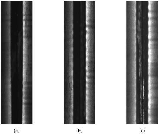The whole dataset contains 52 surveying lines of sidescan and the sidescan sonar Edgetech 4200 MP has a 900 kHz sampling frequency with 1 cm across-track resolution and 0.18 m along-track resolution. The raw XTF files are parsed (see Figure 3) using an open-source software, auvlib [24], developed by ourselves and the waterfall images are downsampled to have 64 bins per side for training, which were found empirically to have a good trade-off between being able to reconstruct some of the rocks in the final bathymetric map and the training time (11–12 h). Three examples of the downsampled waterfall images can be seen from Figure 6, where each waterfall image contains 500 pings and each ping has 128 bins for both port and starboard side.