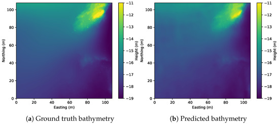 In the proposed method, the absolute depth of the seafloor is obtained by combining the depth of the sonar and the altitude implicitly learned from the nadir model (Equation (5)). With the novel nadir model and modelling the full beam pattern, we could remove the requirement of external bathymetric measurement in our previous work [12]. In particular, our previous work [12] used the MBES measurement to simulate the altimeter readings due to lacking of an extra altimeter sensor on the surveying vehicle. However, with the new nadir model, we could in theory use the same vehicle to survey a new area of interest with no prior map and use sidescan data to create a bathymetric map using the proposed method.