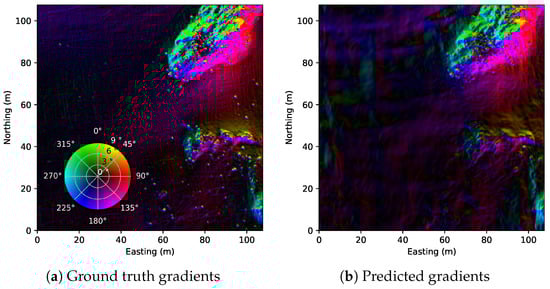 Gradients maps for the surveyed area, where (a) is calculated with finite differences and (b) is directly calculated from estimated bathymetry since is differentiable.