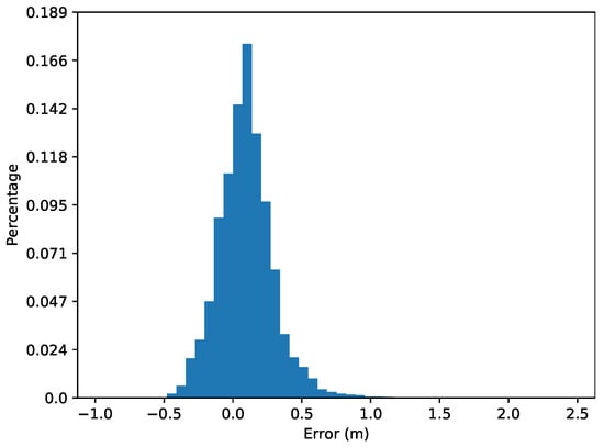 To assess the estimated bathymetry further we calculate the errors on the bathymetry for the proposed method and compare them with previous works [12,16], see Table 4. The estimated bathymetry of the proposed method has a bias of around 10 cm and an average error of 20 cm with standard deviation of 23 cm. However, the maximum and minimum errors are a lot larger than the mean absolute error of 20 cm. The probability distribution function (PDF) curves of the error is shown in Figure 9. We also compare the performance using our previous method [12] and method used in [16] in Table 4. Note that our previous method [12] used the MBES to simulate the altimeter to provide external bathymetric measurement so that the mean absolute error and standard deviation are at centimeter level. In addition, the results from [16] are compared with the Digital Elevation Model (DEM) constructed from SBES and the surveyed area has less variation on the terrain (from 10–13 m depth), while [12] and this work are assessing the proposed methods with data collected from high-resolution MBES from an area at 9–25 m depth.