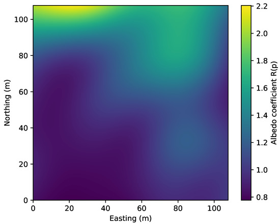 Normalized estimated albedo coefficient across the surveyed area.
