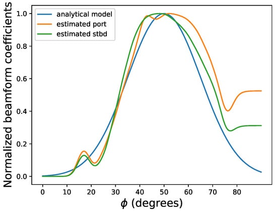 The estimated beamform is displayed in Figure 11 and Figure 12, where we can see the estimated beam profile matches the analytical model [26] using a linear-phased array with a tilt angle . The theoretical beam pattern is calculated as: