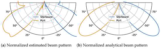 Normalized beam pattern for port and starboard side, (a) estimated beam pattern and (b) analytical model using a linear-phased array with the center of beam at . We can notice the effect of setting angles within to a constant value in (a).