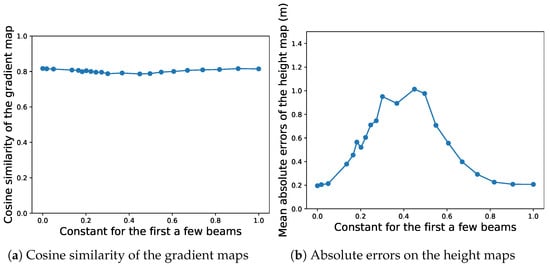 When estimating the beamform, we set beamform corresponding to under to a constant value. Doing such considerably helps the convergence of the optimization. We found out that using different values for the constant C did not affect the quality of the gradient maps, as shown in Figure 13a. The qualitative results for different C are displayed in Appendix A, from which one could barely tell the difference from each other. However, as one can see from Table 5, the absolute height map could deviate from the actual bathymetry, also shown in Figure 13b. This shows the proposed method could estimate the relative height pretty well from sidescan data itself, but one might argue that giving only a few points of absolute height of the seafloor (or even one) could “pin down” the seafloor and reduce the absolute error.