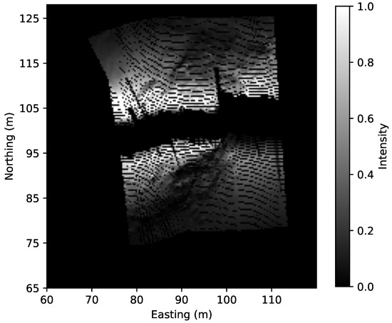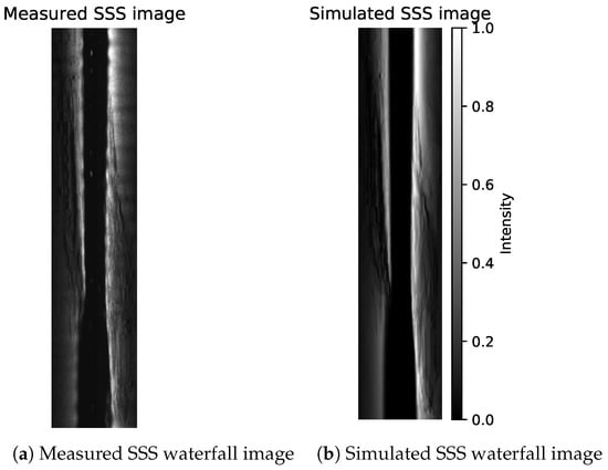 Given estimated bathymetry , estimated albedo R and estimated beam profile , we can calculate the simulated sidescan intensities given sonar’s attitude. An example (more in Appendix B) is displayed in Figure 14 where on the left is the measured waterfall image downsampled to 64 bins per side and on the right is the simulated SSS. The simulated SSS can be georeferenced using the estimated bathymetry, as shown in Figure 15. We can also find that using a Lambertian model gives an image with much less noise. This suggests that some speckle noise filtering on the measured SSS with a higher resolution (or even without downsampling) might further improve the estimated bathymetry, especially for the small features such as rocks.