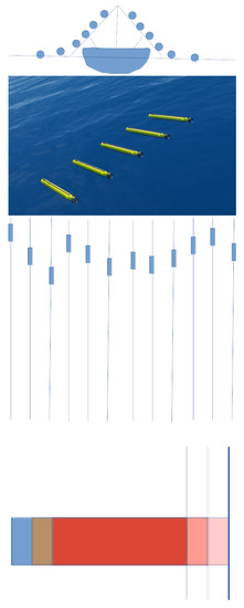 A schematic of a multi-agent small AUV fleet being launched (rather whimsically) from an automatic launcher (top). These would be equipped with sidescan sonar and navigation sensors. Optionally also acoustic modems that allowed them to ping one another according to some timing protocol that allowed ranges between individual AUVs to be periodically measured. The AUVs carry out the survey in parallel lines (middle). Finally we illustrate the resulting starboard side-scan swathes from the first three lines showing how there can be substantial overlap (bottom). Post mission any between-AUV range measurements can be combined with constraints formed by matching features in overlapping sonar regions to improve the dead-reckoning estimates. Once that has been performed the method of neural rendering presented here could be used to estimate the bathymetry. The rendering optimization could even be extended to refining the AUV attitude estimates. Such a system would allow rapid bathymetric surveys to be carried out from small boats with low cost equipment.