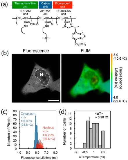In 2015, Hayashi et al. reported an important result; they found that the temperature of the cultured cell nuclei was higher than the surrounding plasma by an average value of nearly 1.0 °C [17]. This was not a surprising discovery, because the temperature at the heat source (the nuclei) must be higher than average (the surroundings) according to thermodynamics. However, this was the first time it had been validated by direct experimental measurements. They created an autonomously cell-permeable fluorescent polymeric thermometer (FPT), which solved the technical challenge of FPT being injected into mammalian cells by microinjection that was present in prior studies [56]. As shown in Figure 1a, the cell-permeable FPT is a combination of a thermosensitive unit (N-n-propylacrylamide (NNPAM)), a cation unit beneficial for cell autonomous penetration (3-(acrylamidopropyl)trimethylammonium (APTMA)) [56], and a fluorescent unit (N-{2-[(7-N,Ndimethylaminosulfonyl)-2,1,3-benzoxadiazol-4-yl](methyl)amino}ethyl-N-methylacrylamide (DBThD-AA)), which displayed a temperature resolution of 0.05–0.54 °C within 28–38 °C in HeLa cells. After being injected into HeLa cells for 10 min, the cell-permeable FPT spontaneously diffused throughout the cells, including the cytosol and nucleus (Figure 1b). The FLIM analysis for the FPT fluorescence lifetime in 49 cell samples indicated an average temperature difference of 0.98 °C between the nucleus and the cytoplasm (Figure 1c,d).
