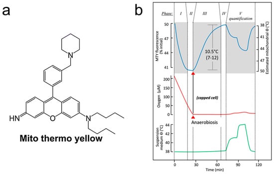 Mito Thermo Yellow (MTY). (a) Chemical structure of the MTY fluorescent probe [57]. (b) Determination of mitochondrial temperature in MTY-preloaded HEK293 cells. Phase I–phase IV support the validity of the MTY thermometric performance [58].