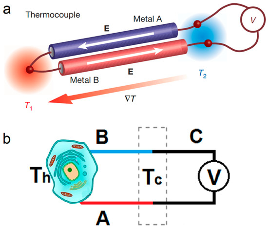 The principle of temperature measurement for the thermocouple. (a) The composition of a thermocouple based on Seebeck effects [78]. (b) Schematic diagram of the cell temperature measurement using the thermocouple.