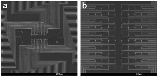 For an array of TFTCs with a junction width of 200–500 nm, a complicated electron beam lithography system and related thin-film techniques are required. Figure 4 presents scanning electron microscope (SEM) micrographs taken from a sample of 100 Pd–Cr submicron TFTCs fabricated on a SiO2/Si wafer, where (a) is the top view of the device, showing the central measurement region and 200 leads, and (b) is the central region of 100 Pd-Cr sensors arranged in a 10 × 10 array [84].