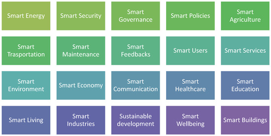 It is expected that 66% of the world’s population will live in urban areas by 2050. Providing this population with adequate resources, including sufficient energy, safe food, and clean water, with economic and social guarantees and environmental sustainability is a real challenge. Many cities today hope to become the smart cities of tomorrow. In order to achieve this goal, a complex plan should be developed, including participation from public and private sectors, product vendors, and providers of information technology services [3,4]. Most of the smart city sub-systems are shown in Figure 2 [5].