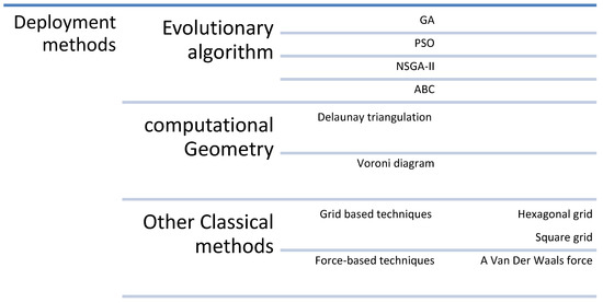 Dynamic deployment is used with mobile WSNs, when the objective is to monitor an event or increase the network’s coverage, connectivity, and lifetime issues. In dynamic deployment or self-deployment, the nodes are randomly deployed first; then, the nodes change their locations to increase the coverage, which means each point in the area of interest should be covered. This type of deployment can be either centralized or distributed. In centralized deployment, the sink node should be a powerful node because it is responsible for finding the new location of each sensor node through deployment algorithms and sending the required location to each sensor. This type of deployment saves energy but may fall to single-point failure problems and cannot be implemented in disasters or battlefields. While the distributed deployment lets each node determines its new position in the monitoring area, this may consume more energy [27]. A summary of deployment methods is shown in Figure 7.