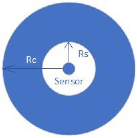 There is always a relation between coverage and connectivity for each application. It is almost assumed that the range of connectivity (Rc) is greater than, or twice, the sensing range (Rs), as shown in Figure 8 [25,30].