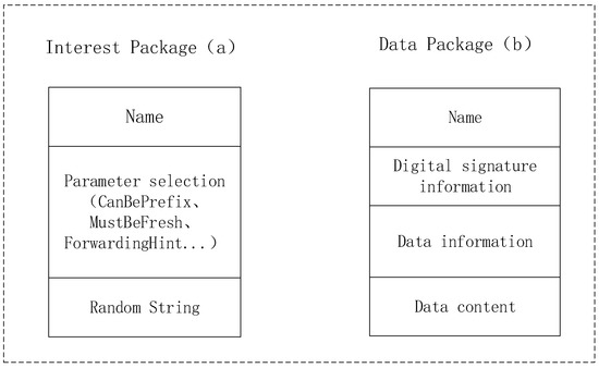 The basic design principle of an NDN is based on the Internet [5], so it can directly use major IP services, such as a Domain Name System (DNS) and an interzone routing policy. It allows routers to track the status of packets and supports multipath forwarding. These features allow content to be cached in the router to meet future requests while enabling user mobility. Consumers send requests for the required data, called interest packets, which are forwarded to data producers by the NDN forwarding daemon (NFD) [6]. Each NFD also includes a forwarding policy module that determines whether, when and through which interfaces the received interest is forwarded [7]. In an NDN, the content packet consists of the data name, the encrypted content, and the signature with the publisher [8]. In addition, the NDN network has only two types of data packets, and the data packet format is shown in Figure 1.