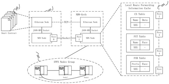 Distributed shared accounts originated in Bitcoin [1]. The blockchain is maintained by all the nodes in the system as a database to record all the transactions in the system. Blockchain is also used in a variety of other applications in many fields and industries, including healthcare, energy management and supply chains [2,3]. A blockchain is decentralized, tamper-proof, traceable, and attack-proof in building peer-to-peer (P2P) communication technology. A blockchain uses cryptography, distributed storage, a consensus mechanism, a smart contract and other technologies. In a P2P network, the communication quality and convergence speed of information are very important issues, and an NDN is used to optimize the inherent problems in a P2P network (such as mobility limitation, transmission semantic overload, double confirmation forwarding, etc.). An NDN is a content-centric network. Unlike traditional IP networks, data is published, requested, managed (modified, deleted, etc.), and accessed by data names. In the nature category of a blockchain, given the way the private chain’s authorized nodes work, the nodes trust each other, which is more conducive to privacy protection.