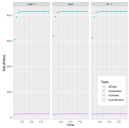 Because of the problems existing in the traditional blockchain network, such as mobility limitation, repeated confirmation transmission of data packets and security, the model replaces the underlying network of blockchain technology with an NDN and integrates the NDN technology with the blockchain to make up for the defects of traditional network and optimize network performance. To evaluate the model, this paper uses a convincing simulation platform in the industry to simulate the performance of traditional and NDN networks. In the experiment, the VIRTUAL machine Ubantu18.04 was used, and two simulation environments NS3 [11] and NDNSIM [12] were installed, respectively. In the simulation environment, the same two-node peer-to-peer network topology was constructed, respectively, and the data rate was set at 100 Mbps, as well as the same transmission delay of 10 ms. To be closer to the actual situation in the TCP communication experiment, a random error rate of 0.00001 was added to simulate the retransmission mechanism. In the experiment, all aspects of the performance of the two networks were compared. Figure 6, Figure 7 and Figure 8 show the operational data results of throughput, packet loss rate, and latency in 10 s, respectively, for the traditional network in the NS3 environment. Figure 9 and Figure 10 are the corresponding experimental results of the NDN network in the NDNSIM environment. The NDN network comparing traditional P2P networks and throughput experiments show that the forward load was more balanced among the nodes in the NDN network. The loss package rate experiment can be seen to be more stable to request nodes and release nodes in the NDN network, the situation being that the loss package is basically absent. The time delay experiment shows, in the NDN network, due to the advantages, such as reverse path sharing, high reuse rate of file routing sharing and named forward, the time delay will stabilize at a lower place. In the process of file sharing, path selection, low packet loss and low delay are important indicators to improve the reliability of file sharing. In summary, the NDN network has more optimal network performance and sharing reliability than the traditional blockchain underlying network, which also reflects the dominant performance of the model constructed in this paper that integrates the NDN network and blockchain technology.