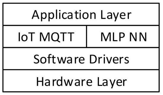 There are four layers for the software architecture as shown in Figure 3. The application layer has the implementation of the diagnosis system. The service layer has the IoT MQTT service and the MLP-NN service. The software drivers’ layer interfaces the hardware layer with the services and the application layer.