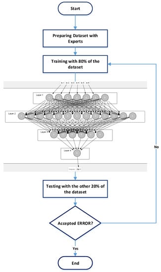 Finally, the testing phase is initiated with the testing data, which is the other 20% of the dataset. An error of less than 0.1 is accepted. If the error exceeds 0.1 for any test-case, the learning process will be repeated to reach less than 0.1 for all test-cases.