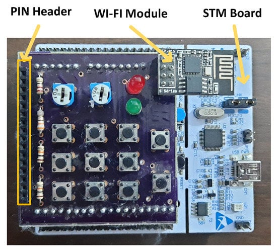 A CIoT hardware platform was implemented as shown in Figure 5 to meet the proposed solution. The platform has three main parts; a WI-FI module for IoT MQTT connectivity, a PIN header for sensors’ interfacing, and a cortex microcontroller for the firmware implementation of the MLP-NN Model and the IoT MQTT client. It is based on the STMicroelectronics (STM) Board. An STM32F401RE microcontroller (MCU) is the main MCU for this board. It has an ARM Cortex-M4 32-bit processor architecture. This processor is a 32-bit processor. It has memories of 512 KBs FLASH and 96 KBs SRAM with a processor speed of up to 84 MHz as a maximum processor speed that is a very low speed with respect to normal PCs or server machines.