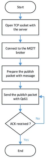 As shown in Figure 6, a TCP connection should be established at first, with an MQTT broker with the server domain name and port. Now, a TCP socket is opened with the server that has the MQTT broker installed. The next step is to send an MQTT connection establishment packet (CONNECT packet). It includes a client identification, and some of connection parameters and flags.