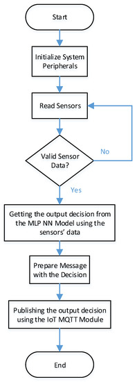 As shown in Figure 7, the main firmware will initiate the main MCU peripherals. An RTOS task is created to read the sensors connected to the system. It will validate the sensor readings. It will send the sensor’s valid readings to the MLP RTOS task that is used to process the MLP-NN Model. The MLP task will obtain a decision and prepare a message. It will send the message to the RTOS IoT task to publish the message.