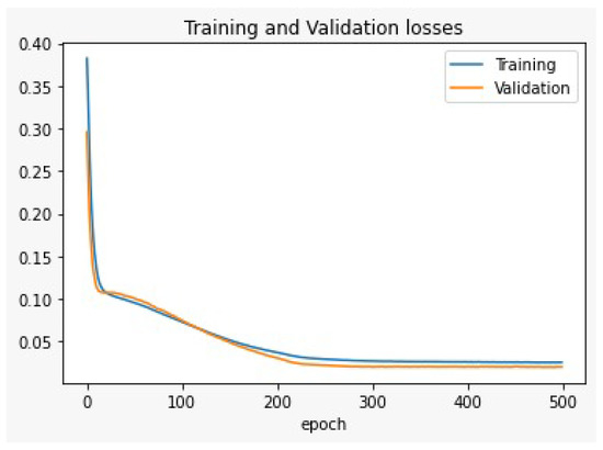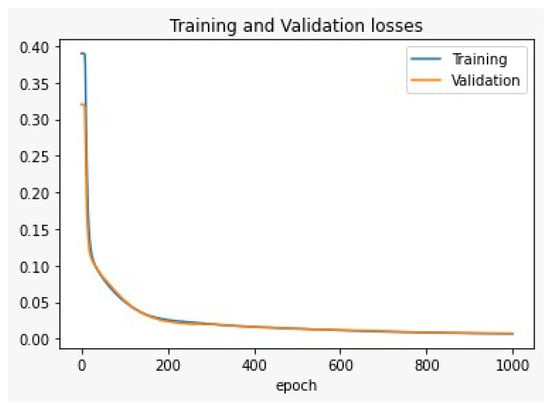 The training and validation losses or the double hidden layers deep learning (MLP).