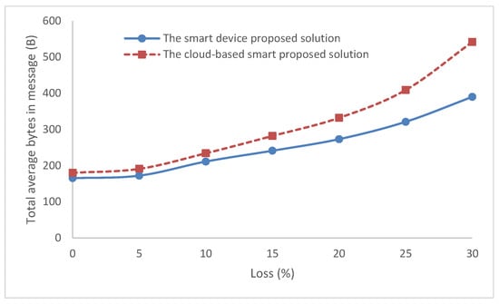 The total average bytes in message for the two solutions with network loss.