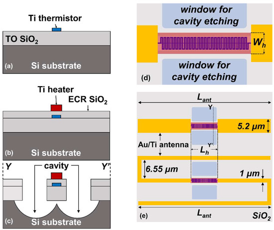 Cross-sectional view of the fabrication processes and top view of the detector: (a) 50-nm-thick Ti thermistor deposition on top of 200-nm-thick thermally grown SiO2; (b) Ti heater deposition on top of 100-nm-thick ECR SiO2 interlayer. The heater is aligned on top of the thermistor device for effective thermal coupling; (c) cavity hole fabrication for thermal insulation of integrated heater and thermistor; (d) heater coupled to the antenna gap on top of meander thermistor. Heater width (Wh) is varied to attain wide resistance range; (e) halfwave dipole antenna (top) and folded dipole antenna (bottom) design structure used for THz characterization. Illustrated dimensions are not to scale with the real dimensions.