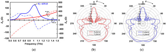 In this study, a common 0.1 μm wide thermistor was designed in meander structure for longer effective length and higher resistance [45]. The heater was designed in fixed length (Lhea) with twelve different widths (Wh) as illustrated in Figure 1d. As we fabricated a wide range of heater resistances, two type of antenna in the shape of halfwave and folded dipole were designed and fabricated with individual antenna length (Lant) and width (Want), as illustrated in Figure 1e. We have simulated the proposed Au antennas on the high-resistivity Si substrate by CST electromagnetic simulator. The antenna length is set so that the imaginary part of the impedance becomes 0 at 1 THz (resonant frequency) as shown in Figure 2a [46]. The proposed folded dipole antenna has an impedance of 675 Ω at 1 THz, while the halfwave dipole antenna has an impedance of 23 Ω at 1 THz. The simulated 1 THz directivity in the broadside (substrate) direction were 4.9 dBi and 5.5 dBi for the halfwave dipole and folded dipole antenna, respectively, as shown in Figure 2b,c. The directivity pattern shown in Figure 2b,c indicates that the folded dipole antenna has a relatively similar radiation pattern to the halfwave dipole antenna.