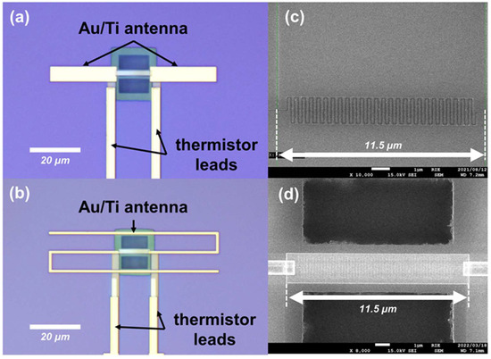 The studied detector is composed of an integrated titanium (Ti) thermistor, interlayer, Ti heater, and gold (Au) antenna stacked on a high resistivity Si substrate (p-type, ρ: 4.2–9.5 kΩ·cm). Fabrication processes were performed sequentially from the bottom to top layer. Prior to thermistor fabrication, 200-nm-thick thermal oxide (TO) SiO2 was grown on the Si substrate using the wet oxidation technique under atmospheric pressure for 30 min at 1000 °C, without any pre- and post-treatment. After that, the meander thermistor was patterned and then deposited. Figure 1a illustrates the fabricated thermistor on top of TO SiO2. At this point, electrical insulation was then formed by deposition of 100-nm-thick electron cyclotron resonance (ECR) sputtering SiO2 interlayer. Once the interlayer as complete, the heater structure was patterned and deposited, as illustrated in Figure 1b. The contact hole for the thermistor feeding line was then patterned and etched on the interlayer by CHF3 reactive ion etching (RIE). The Au antenna and measurement pads were patterned and deposited afterwards. More precisely, a 20-nm-thick Ti thin film was first deposited below the Au thin film to strengthen the adherence of the Au film to the interlayer surface. Finally, a deep cavity for thermal isolation was formed by CHF3 RIE and SF6 plasma etching on the SiO2 and Si layers, respectively, as illustrated in Figure 1c. The suspended structure of the thermistor and heater was confirmed by the lateral etching during cavity fabrication. All patterning and metal deposition processes were performed by electron beam lithography (JEOL Ltd., Akishima, Japan, JBX-6300SP) and electron beam evaporation (Shinko Seiki Co., Ltd., Kobe, Japan, SV-A474) system, respectively.
