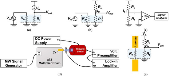 Equivalent circuits and block for detector electrical and optical measurements: (a) circuit for electrical responsivity; (b) circuit for frequency response; (c) circuit for noise analysis; (d) THz optical responsivity measurement block; (e) electrical connection inside vacuum Dewar.