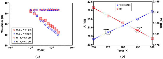 Material parameters of thermistor and heater: (a) thermistor () and heater () resistance dependence on heater width () with different heater thickness (); (b) thermistor resistance and TCR dependence on temperature from 240 K to 300 K.