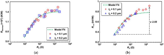 where is the slope of the thermistor resistance change for a given square input current. Figure 6a shows the of thermistors calculated by Equation (3) with respect to the change in heater resistance () on 0.1 μm and 0.2 μm heater thicknesses (). As shown, of the thermistor increases as heater resistance increase. As we use a common thermistor design with the same electrical parameter, the main contribution to increase came from the improvement of in the thermistor. It is also revealed that the change in could affect to the temperature increase in the thermistor under the same bias current. However, as is also observed, the trend is not linear to the increase, and a saturated is predictable as the becomes very large. At that point, the thermal parameter of the detector was dominated by another structure, such as the SiO2 interlayer or thermistor. Further analysis of the thermal parameter has been made by a fitting line based on a resistor-equivalent parallel circuit of thermal resistance contribution from the heater () and another detector structure (i.e., SiO2 and thermistor, hereby symbolized as ), as illustrated in Figure 7. We assume the heater electrical resistance conversion ratio to its thermal counterpart to be a variable of a. The model used to predict the calculated thermal resistance () is then given by