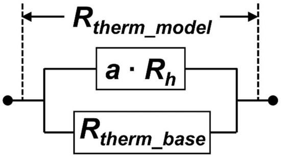 Thermal resistance model in the microbolometer: a∙Rh represents the contribution of thermal resistance from the heater (red square box in Figure 1c), and Rtherm_base represents the contribution of thermal resistance from other detector structure, i.e., the thermistor (blue square box in Figure 1c) and SiO2.