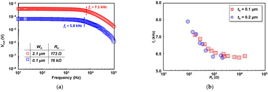 The that gives minimum error extracted as the cutoff frequency. It is notable that higher with higher responsivity has smaller , thus earlier response roll-off is observed. The cutoff frequency () dependence to is shown in Figure 8b. As shown, decreases as increases, which is opposite to that of responsivity. This can be explained by the lower thermal diffusivity of the SiO2 compared to Ti from the heater [54,55,56]. As the Ti heater width is narrower (resulting in increase), the volumetric ratio between Ti and SiO2 becomes smaller, and the heat generated in the heater is diffused more slowly. It is also important to note that the extracted is based on the temperature fluctuation frequency which is double the AC frequency applied to the heater. Additionally, the measured can be further adapted to extract the detector’s thermal response time () by the relation of . Indicating that the faster response can be expected for the detector with higher as the impact of smaller heat capacitance.
