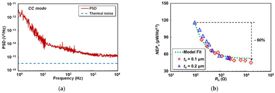 Noise evaluation of the detector: (a) power spectrum density (PSD) estimated in CC mode; (b) electrical noise equivalent power () evaluated at 1 kHz, with the standard deviation of 4.5 pW/Hz0.5 between measured and fitting results.