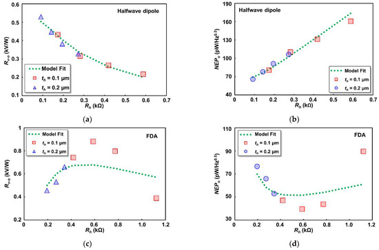 The extracted was obtained by changing the and c variable to minimize the discrepancies between measured optical responsivity (Rv-o) and calculated optical responsivity (). Note that extracted b variable from Equation (5) together with and a variables from Equation (4) are included in Equation (7) because the thermistor design is identical and so the thermal contribution parameters are also the same. The extracted value of for the halfwave dipole antenna device is 20 Ω which is close to the simulated resonant resistance result in Figure 2. Moreover, the extracted value of for FDA is 358 Ω which is far from the simulated resonant resistance of FDA. As for the optical NEP results, fitting trends were taken by dividing the estimated voltage noise in 100 kΩ mode with the calculated optical responsivity fitting model in Equation (7). From the graph in Figure 10a,b, we can see the proposed model fit to the THz optical responsivity and NEP for halfwave dipole antenna. Inevitably, there were some higher discrepancies found for fitting the results of FDA in Figure 10c,d due to the limitation of our proposed model for the high-impedance antenna. The extracted from Equation (7) for FDA devices were shifted from the resonant resistance based on the electromagnetic simulation. Nevertheless, the fitting model presented in Figure 10c,d can still be considered for the first order approximation and as a fair comparison to the fitting model of the halfwave dipole antenna. Future works will improve the model for high-impedance antenna coupled to a high-resistance heater to accurately predict the behavior of the device.