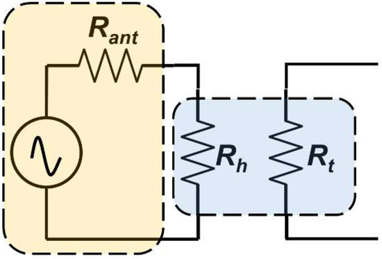 Further analysis was taken by the model fit line based on the Equation (7). The additional circuit diagram illustrated in Figure 11 is considered due to the fact that input power to the heater was mainly contributed by the antenna, and impedance matching between the antenna and heater significantly affected the THz input power. The input power (power consumption in the heater) can be estimated based on the input voltage () generated at the antenna gap and both antenna () and heater () resistances. Given the responsivity model in Equation (5) and circuit diagrams in Figure 11 for THz input power, the THz optical responsivity fitting model () can be summarized by the following equation