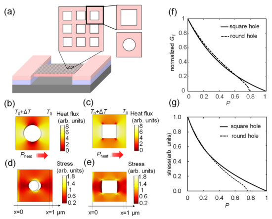We determined how the thermal conductance and mechanical strength of the MEMS beam were affected by the porous nanostructure by using the finite element method (COMSOL Multiphysics 5). Because we discuss a periodic structure here, we chose only a single component from the hole array for the calculation, as schematically shown in Figure 1a. We considered two designs for the porous nanostructure, with a round hole and a square hole as the basic units. We assumed that the basic unit shown in Figure 1a had a size of 1 μm × 1 μm × 1 μm, and the size of the hole ranged from 0 to 1 μm. Thus, the passivity of the structure, P, changed from 0 to ~0.79 for the round hole structure and from 0 to 1 for the square hole structure. To calculate changes in the thermal conductance of the structure, we assumed that there was a temperature difference of ΔT = 1 K between the two edge surfaces of the basic unit. We then calculated the heat flux H so that the thermal conductance of the basic unit between the edges was derived as GT = H/ΔT. Figure 1b,c show the calculated distribution of heat flux for units with round and square holes, respectively. The derived normalized thermal conductance is plotted in Figure 1f, where the solid and dashed curves represent the thermal conductance of the round hole design and the square hole design, respectively. The thermal conductance decreased quickly with the increase in P. For the round hole structure, the thermal conductance dropped to zero when P = π/4 ≈ 0.79, where the diameter of the hole was equal to the width of the unit, and the structure will be cracked in reality. On the contrary, the square hole structure yielded a higher P, approaching ~1.