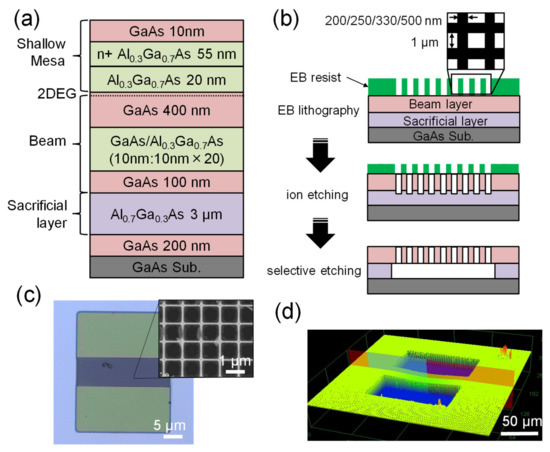 We grew a modulated AlGaAs/GaAs heterostructure on a GaAs substrate through molecular beam epitaxy [25] to fabricate MEMS beams with a porous nanomesh structure. The wafer structure is schematically shown in Figure 2a. After growing a 200-nm-thick GaAs buffer layer and a 3-μm-thick Al0.7Ga0.3As sacrificial layer on a semi-insulating (100) GaAs substrate, we formed the beam layer by depositing a 100-nm-thick GaAs layer, a 20-period GaAs/Al0.3Ga0.7As superlattice structure, and a 400-nm-thick GaAs layer. A mesa layer with a 20-nm-thick GaAs layer, a 55-nm-thick Si-doped Al0.3Ga0.7As layer, and a 10-nm-thick GaAs capping layer were formed on the beam layer. In past work, we used the mesa layer to form piezoelectric capacitors to electrically drive and detect the oscillations of the MEMS beam. However, in this research, we did not deposit any electrode on the MEMS beam to avoid the influence of metal electrodes on measurements of its thermal conductance. Instead of piezoelectric capacitors to drive and detect oscillations in the MEMS beam, we placed the beam on a piezoelectric block to excite vibrations and probed the induced oscillations by using a laser Doppler vibrometer.