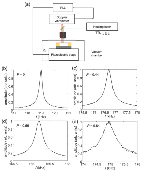 Figure 3a shows the experimental setup used to measure the mechanical oscillations and thermal conductance of the MEMS beam. The entire MEMS chip was placed on a piezoelectric block that was used to drive vibrations in it. The induced vibrational motion was monitored with a laser Doppler vibrometer. The oscillation spectra were measured by a lock-in amplifier with a built-in PLL (Zurich HF2LI) [19]. To measure the thermal response of the MEMS resonator, we used a second laser with a wavelength of ~530 nm to heat the MEMS beam. Its output power could be modulated with an input transistor–transistor logic (TTL) signal. The output power of the laser was ~5 mW, and we used a light attenuator to reduce the power to serval μW so as to avoid the overheating of the MEMS beam. We carefully aligned the laser heating spot with the geometric center of the MEMS beam. All the measurements were performed at room temperature in a vacuum of ~10−5 torr.